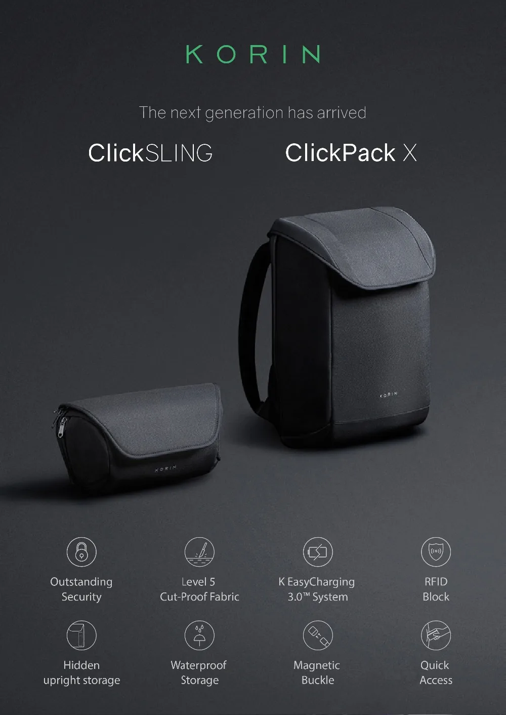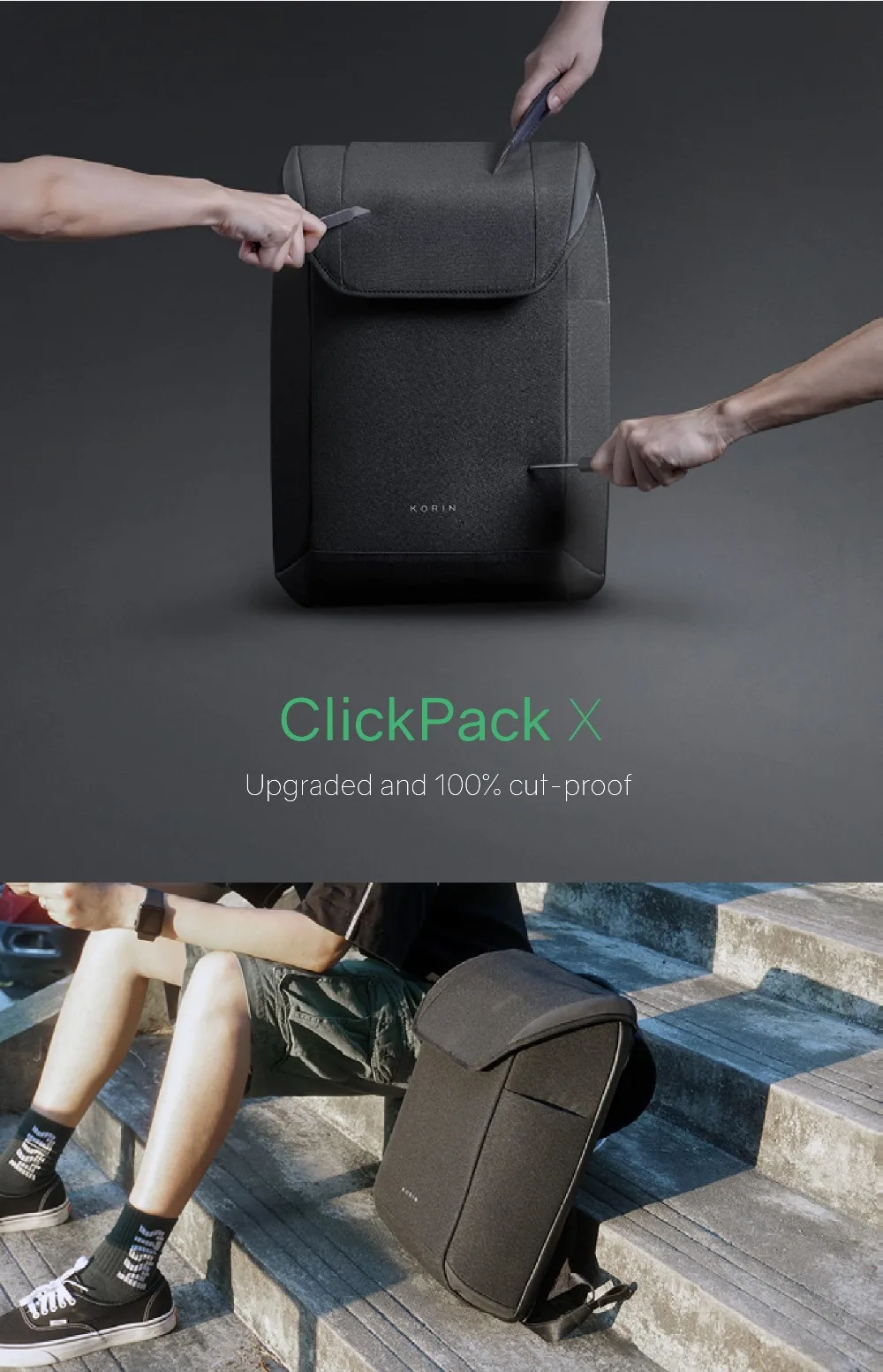 Das Click Pack X von Korin ist mehr als nur ein Rucksack – es ist ein Meisterwerk der Sicherheit und Funktionalität. Mit seinem Klick-Anti-Diebstahl-System, dem Teleskopstahl-Kabelschloss-Patent und dem YKK explosionsgeschützten Reißverschluss schützt es Ihre Artikel zuverlässig.